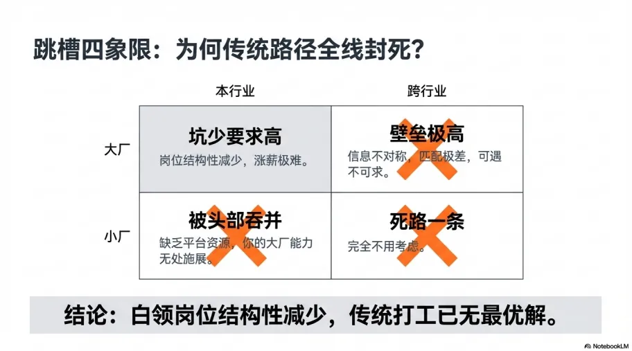 往哪里跳、怎么跳,我把所有可能性的路径,用四象限来表述:本行和跨行、大厂和小厂。