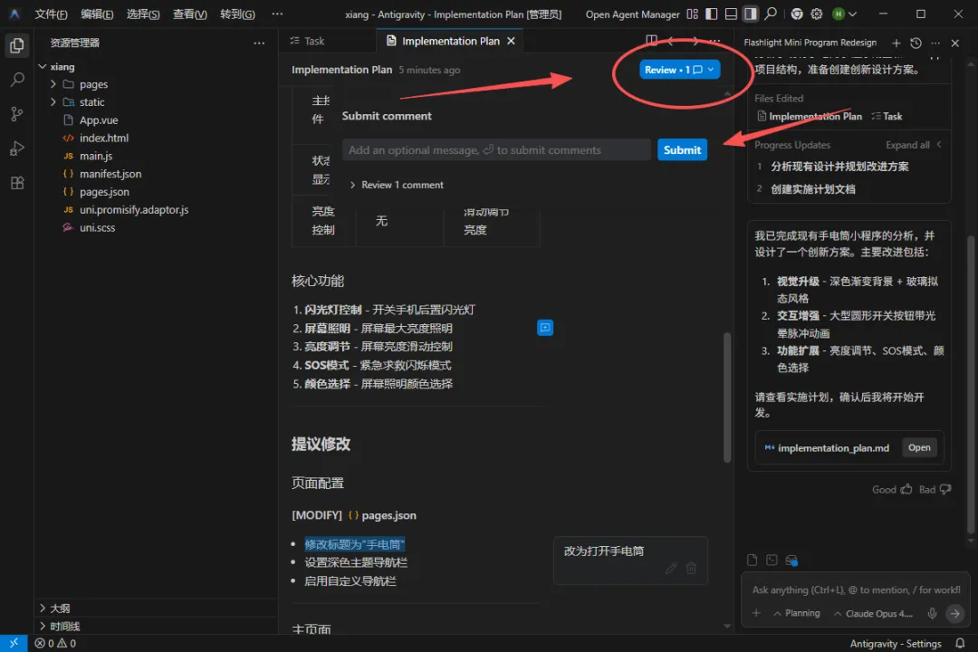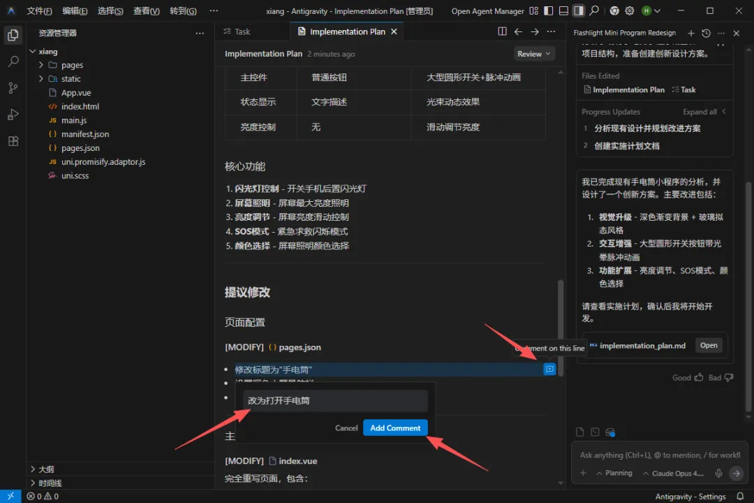 当AI根据我的要求执行完毕后,会形成一个设计文档,我们可以查看文档,然后找到需要调整的地方增加评论,方便AI进行调整。