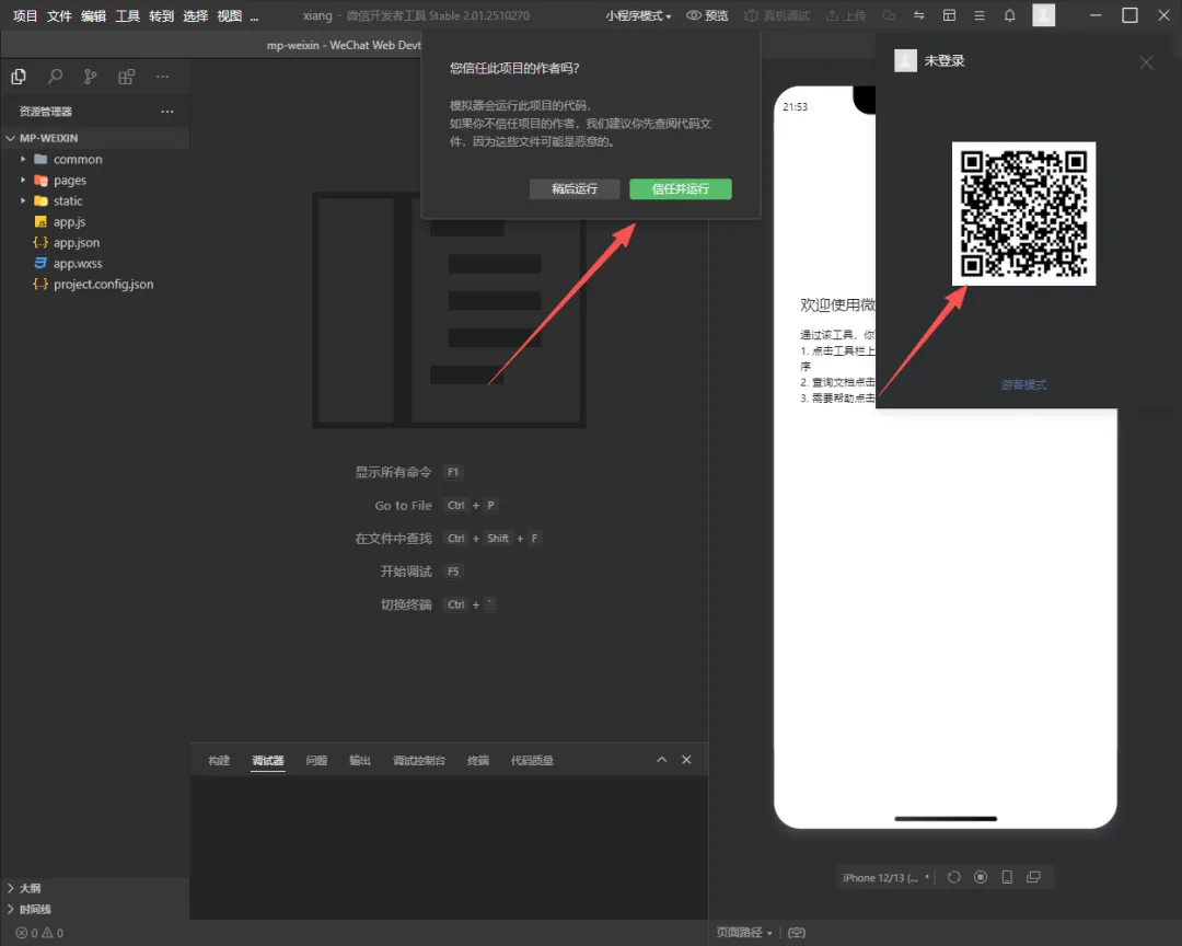 当AI开发完成第一版以后,我们就可以查看下效果了。我们运行微信开发者工具,运行后需要点击【信任并运行】,然后扫码登录微信开发者工具。