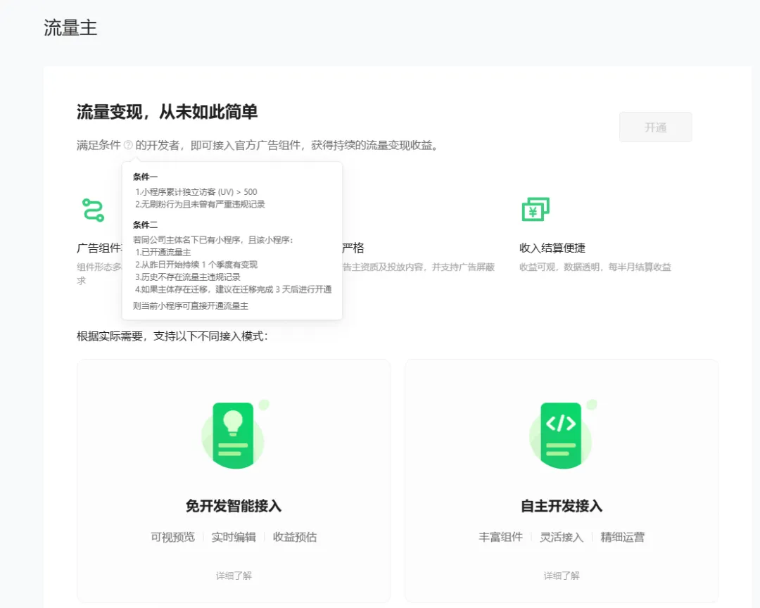 开通条件: 想要开通流量主需要满足,小程序独立访客大于500人,没有违规记录。