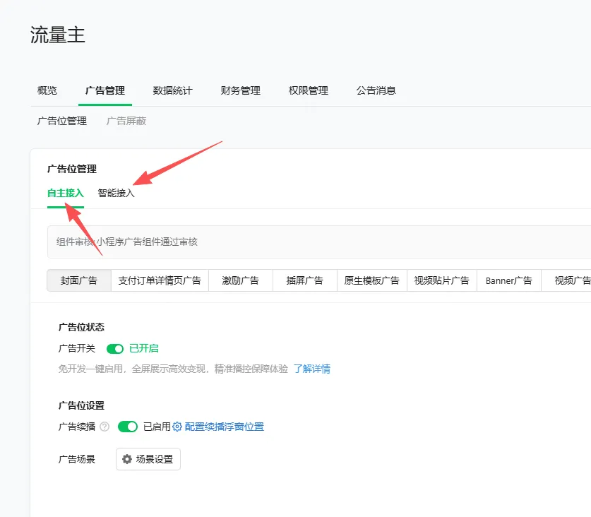 开通流量主以后,会有两种广告方式:自助接入和智能接入。