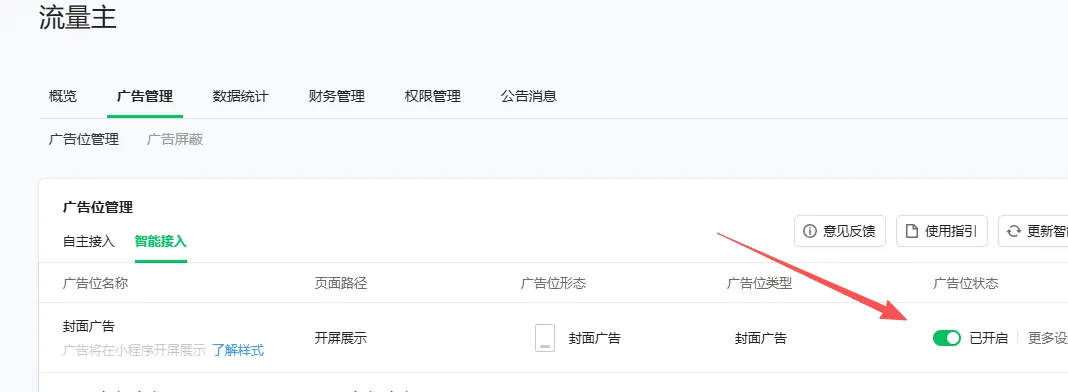 重点来了:无论是自主接入还是智能接入,一定要打开封面广告,因为封面广告的价格更高,属于主要收益来源。