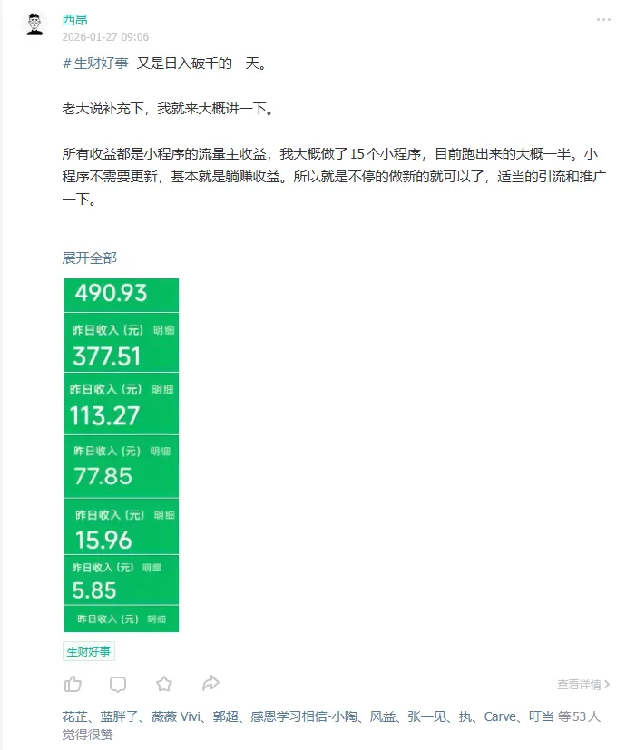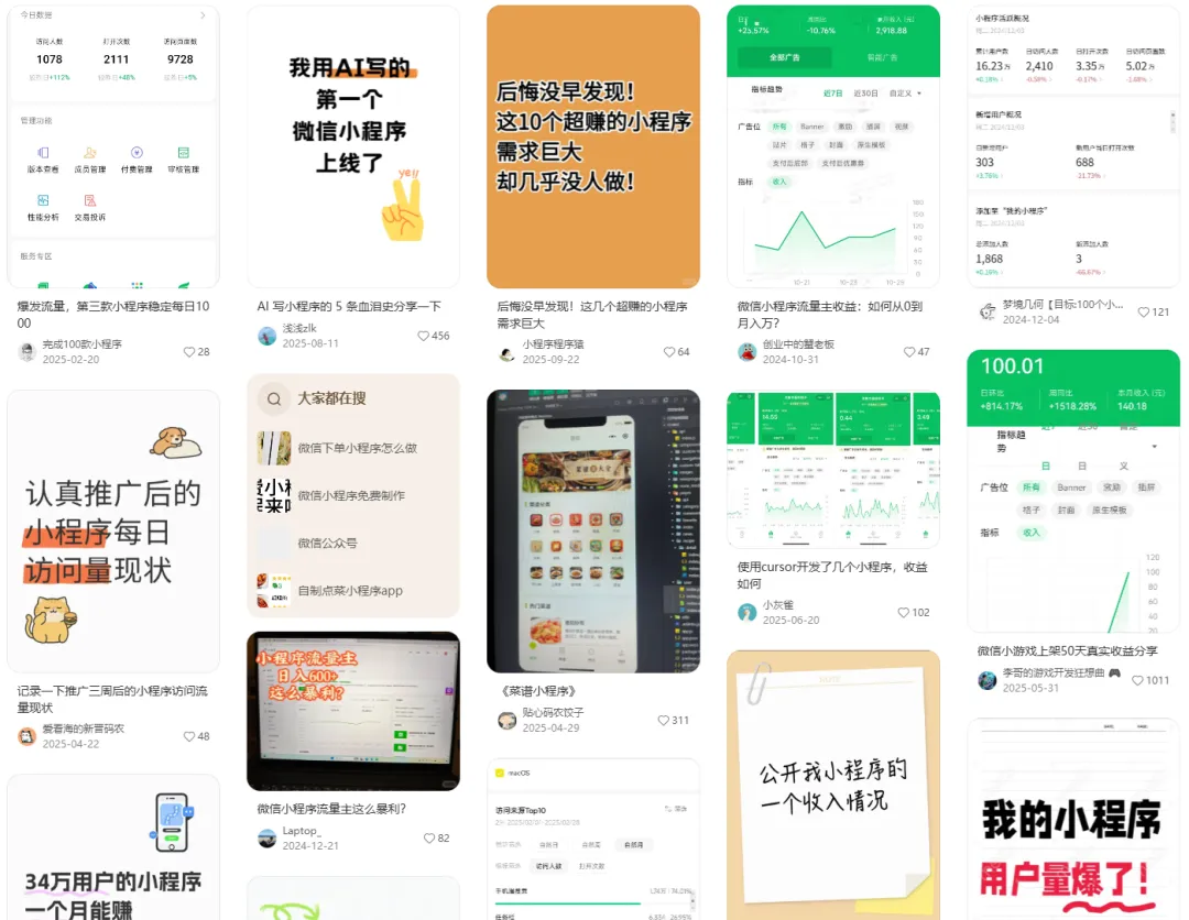 后来我花了不少时间研究那个小程序为什么会爆,然后把经验复用到其他小程序上,慢慢就有了稳定的收益曲线。