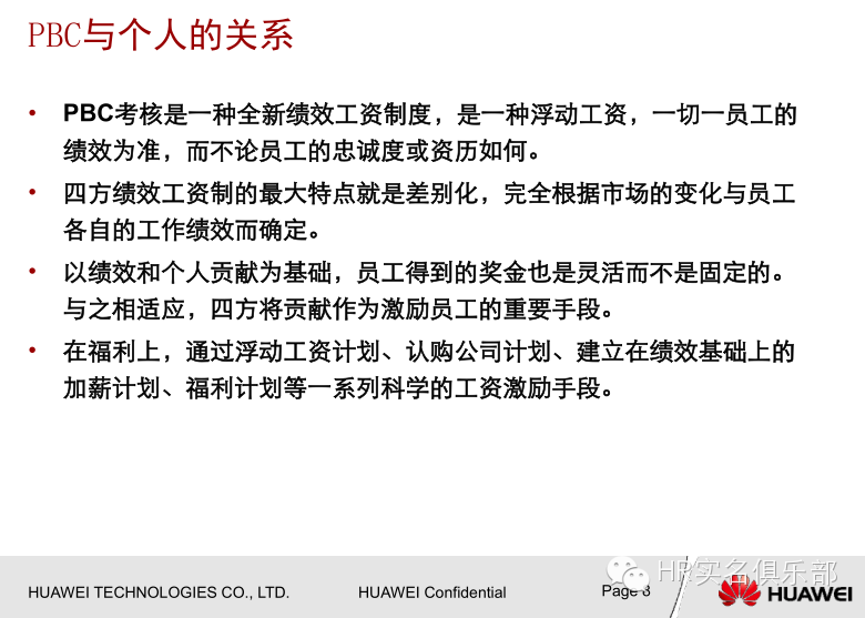 在薪酬沟通上,要明确是应该积极地和员工进行普及和互动还是消极被动的回答员工问题,如果需要对员工进行有选择性的沟通,要明确信息公开沟通的程度。具体可参照华为的如下操作: