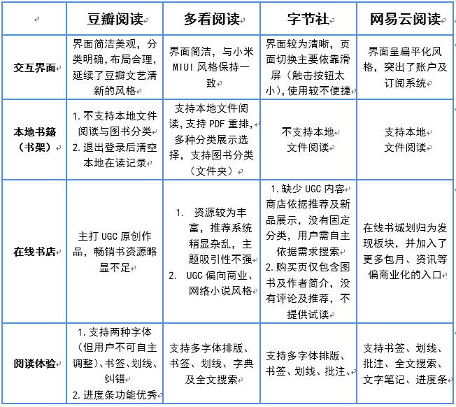(八)阅读界面 阅读界面支持图文混排,但仅支持楷体和雅黑两种字体。触击页面底部或顶部均可调用功能栏。顶部功能栏主要为购买(如已购买则该图标不显示)、添加快捷方式、分享与作品详情。个人体验过程中尝试添加快捷方式失败,桌面并未显示任何导向书籍的图表或按钮,不确定是否是手机原因还是功能漏洞。底部功能栏显示进度条、目录、笔记、评论、设置。其中进度条设计非常友好,用户可以直接拖动进度条进行翻页(但是无法选择直接跳转至特定页码)。此外,笔记功能非常无奈,进入后发现仅能设置书签与划线,并未提供文字输入及批注功能。 五、任务走查 (一)购买书籍 步骤:搜索(或扫码)——点击条目——浏览作品详情——点击购买——账户余额支付或支付宝跳转 优点:购书效率高,流程简单,页面简洁美观 缺点:没有其他网站价格的对比,用户难以完成比价;用户评论较少,难以通过评论判断图书优劣 评价:购书的实际体验比较好,页面美观,操作便捷。但是缺少了比价功能与UGC书评展示,用户难以对书籍完成比较或判断。 (二)阅读书籍 步骤:本地图书——已购作品——翻页查找或直接搜索——点击条目——阅读——完成划线及添加书签 优点:阅读页面简洁美观;下拉页面直接添加书签非常方便 缺点: 1.未购书籍一旦退出登录便无法恢复,用户很可能损失对书籍的收藏和购买欲; 2.用户不可对书籍进行分类,也不能阅读本地文件; 3.通过已购作品进入阅读中间会跳转至购买页面,增加了额外操作; 4.下拉添加书签时可能把手机功能栏拉出来,存在一定用户出错率; 5.用户不能对书籍添加文字 评价:阅读体验一般,仅支持常规的阅读、划线、书签等功能。进度条功能使用起来非常舒服,但尚不足以评为亮点。产品功能有待进一步改进。 六、竞品分析 如果将豆瓣阅读划归为UGC文学的阅读器,那么在作品数量、质量上能与其竞争的产品极少或者暂时没有。本处将豆瓣阅读作为一般阅读APP,选取了用户评价较高的多看阅读、字节社、网易云阅读进行比较。 七、个人建议 通过产品体验及相关竞品分析,以个人的想法对豆瓣阅读提出以下几点建议: (一)本地在读 1.增加本地书籍分类功能(如文件夹),方便用户对图书进行整理、归纳。对于有大量书籍收藏、讲究条理的用户来说,书籍分类非常重要,可以大大减轻在茫茫封面中找一本书的烦躁; 2.退出登录后仍保留本地在读的历史存储。一旦退出登录或因更换手机等原因重新进入APP后遗失了所有的历史存储是非常遗憾的事情,不仅仅在于需要一本一本的重新添加(何况还没有整理功能),还有可能破坏个人购买意向; 3.支持本地文件阅读。用户往往需要对本地文件进行浏览,支持本地阅读可以更好地增加用户使用频率。同时,一旦退出登录后已下载的已购书籍都不能正常显示,仍需重新下载,着实着实使用体验; 4.优化已购作品阅读路径,去除重新进入导购页面一环。 (二)作品商店 1.书籍导购界面布局有待优化,如将标签提升至页面中部或上部分; 2.可考虑对接豆瓣书评系统,开放非付费用户平均显示。豆瓣高质量的书评是豆瓣UGC资源的重要部分,在购买过程中无法查看相关书评(仅有购买体验短评)不仅无法充分利用豆瓣资源,也会影响对用户购买欲望的引导; 3.不同类别的推荐(顶部推荐、主题推荐、分类推荐等)存在重叠,有待进一步优化; 4.分类页面增加图书与杂志资源数目,便于读者了解并保持界面的统一性。 (三)阅读功能 1.增加文字批注或笔记功能。对于常读书的用户往往在感兴趣的章节乐于添加个人想法或灵感,增加该功能能更好的提升用户体验与黏性。 2.增加字典功能。英文原版书籍或偏文言书籍往往需要额外查询,增加字典功能减轻了用户切换界面查询的压力。 (四)其他 产品文件包过大。作为功能相对简洁的一款产品来说,17.4M的安装包实在显得有些累赘,建议尝试缩小安装包或扩充功能。 八、总体评价 总体来说,豆瓣阅读延续了豆瓣一贯简洁、清新、文艺的风格,书籍分类、界面布局及交互都显得非常合理且友好。尤其对于豆瓣用户没有风格、界面的差异,学习成本很低。其主打的UGC作品较为丰富、质量较高,更符合豆瓣用户的兴趣,也有利于培养、激发用户的付费习惯。但是对于产品功能上仍存在较多的改进空间,期待豆瓣阅读的不断完善! 本文由一只“产品go”精心出品,欢迎大家进行评论+指正+吐槽。日后小白将继续(不定期)更新各种产品体验报告~另外有对小白的文章感兴趣的朋友欢迎关注公众号:产品经理go,我将定期发布各类干货+伪鸡汤。 来源:产品100 |