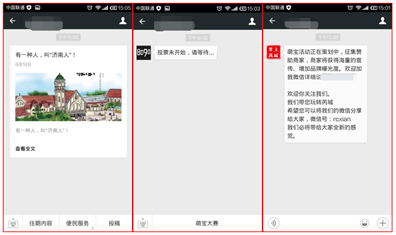 第一图:被添加回复设置是利用的一条本地用户能够产生共鸣的历史图文消息。这种设置确实很聪明,对于本地用户而言,是很热衷于此类信息的阅读,亲和力很强,瞬间拉近与本地用户关系。 第二图:无论是从自定义菜单到被添加回复,都是萌宝活动的一个设置,但是,问题来了,万一不是参加萌宝的人进来呢?这样单一的设置真的好吗?建议不要这样因为一个活动而忽视了其他的平台功能和内容。 第三图:首先是介绍近期活动的进展情况,紧接着介绍平台的功能和定位。虽然无自定义菜单设置,但是这样简单的回复也让用户很舒服,至少不会感觉到平台的空旷和冷清。 通过以上几个平台的被添加回复设置,我们看出,运营者对此功能利用的认识不一,设置也不尽相同。九品堂珍哥认为:如果你没有自定义菜单,你需要在被添加回复里给来访者提示点什么; 如果你有自定义菜单,并且有明确的分类,那在设置被添加回复时就不要太过热情的进行第二遍的赘述了,因为用户关注了你,进入了帐号,他第一个反应还是会随便点点看看的,如果他是一个小白用户,他也会很好奇的进入各个模块看看。这个时候简单而暖心的问候语,可能更能给用户带来好感,但是一定不要省略,不要吝啬一句问候。 但是有些时候,自定义菜单不能完全的展示你的平台功能,那你可以用一个以平台功能介绍为内容的图文消息来作为被添加回复,但是图片不要太多,在中国流量还是很贵的,所以一个封面图即可;标题要暖、要有人情味,也可以做个标题党。如果用户关注进来,在没有其他历史消息的情况下,屏幕上仅存的一个消息他们是会乐意点开看看的,当然像第二组第一图那种针对用户喜好的图文消息也是极好的。 如果你确实想强调一下你当下的活动,也可以设置一条关于活动的图文消息,但是不要让活动掩盖了你的平台的其他功能和内容。请记住:很多用户是不知道如何查看“历史消息”的。 自定义菜单设置 以上说到,来到平台能看到的除了被添加回复在就是自定义菜单设计了,也就是说,这是一个公众号的门面,所以他的设计也会关系到人们对平台的认识,当然他的存在不仅仅于此,在此我们接着往下说: 在一个成熟的公众平台里,自定义菜单的设计也是很重要的,这是微信平台上最为直观的东西,所以,它的设计一则能看出平台的成熟与否,二则能揣测运营者的用心所向。以下是本人关注的某公众号自定义菜单设置,以它为例,进行分析: