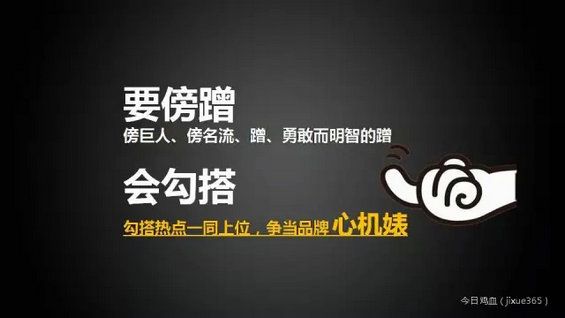如果说叶茂中老师的话具有很重的屌丝色彩,鸡血君总结的内容就有点小三范儿。我认为,无论今天出现了什么样的热点,总有一款或者总有一个方向,能被我们所利用,所借势。所以,现在的企业、品牌、产品,需要的不是一个呆呆坐着写文案的人,而是一个会通过和“势”这个大房争夺话语权,从而上位的心机婊。