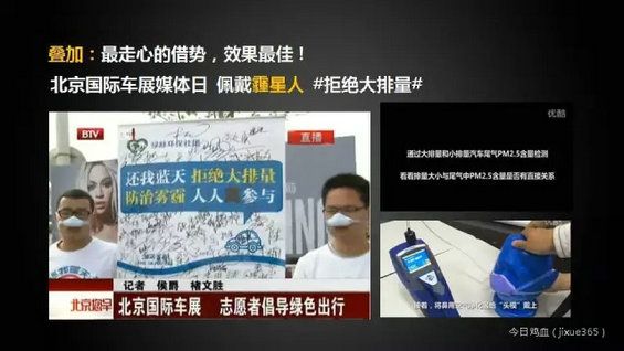 然后,霾星人又在4月25日推出首部求真类型的微试验《排量越大,尾气PM2.5含量越多吗》。借助权威媒体,让更多的人了解到大排量和污染的关系,提升消费者信任度。