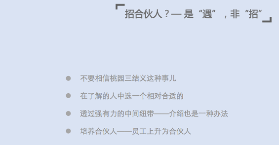 本文内容整理自8月1日36氪主办的创业课KrLass第一期,整理自看准网(Boss直聘)创始人赵鹏围绕“创业公司如何组建团队”的主题做的分享,内容和分享顺序稍有出入。赵鹏曾担任智联招聘 CEO,也曾在中赫集团互联网投资部做过投资工作。 创业者问:怎样让早期创始团队的成员接受之后空降成为管理层、并获得股权的人?后来的人应不应该获得更多的股权?在这个时候一是要考虑早期创始成员来得早,二是这群人在公司发展过程中都有些“位高权重”。 在这个事情上,如果我们能放一发马后炮,假如时间回到创立公司的那一天。在早期进行利益分配时,并不需要一开始就把股权都分得干干净净,可以设置员工期权池这样的机制,给未来留下一定的空间。这个事情上创始人可以开诚布公的告诉创始团队,“未来团队可能要迭代,应该给后来的人有余地”。如果大家不积极,创始人不妨从自己开始。 当然,人生没有如果,我们现在回想,当时确实犯了一个错误。现在能怎么办呢?我没有很多“术”上的东西要分享。当时做的决定造成了公司现在的样子,我的建议就是开诚布公的去跟创始团队沟通目前公司的情况,现在的样子可能是1000块的市值,调整之后是1000亿的市值,要做哪一个自己选。如果对方真的很固执,那也没有办法。种瓜得瓜,种豆得豆。(注:文章之后会聊如何找合伙人) 阿里巴巴早期的 18 个创始员工,也没有现在都留下来担任高级管理岗位。但是中间马云没有拿走他们其中一个人的股份,哪怕是之后很多类似卫哲这样的高级别管理层入伙。阿里集团上市时马云只有 8% 的股份,并不是个人持股者里最高的。又怎么样呢?讲好的事情要坚持。如果团队中确实有人干了Ugly的事,家法处置。但是要记得的是,Deal is deal。 另外,我还要放的一发马后炮是,你一开始弄这么多“位高权重”的干嘛?早期组织尽量扁平,两级已经是最多的了。曾有人这么跟我分享过,“创业公司最理想的情况就是每个人都知道每个人在做什么。并且知道在什么样的时间我能够帮你做什么样的事情。” 创业者又追问:但目前很多创业团队创始人都是草根出身,一开始没有办法和资源去找到优秀的合伙人… 这是我要放的第三发马后炮,合伙人是不能随便解雇掉的,连解雇一个雇员都要慎重,何况是创始人?因此早期挑选合伙人的时候一定要慎重,跟谁合伙做生意与跟谁过日子一样重要。 在滴滴打车 CTO 张博加入滴滴打车之前,滴滴的应用一直是外包,也做了很久。到了一定的时间点,需要这么一个人,张博就去了。当时他不是什么大牛,百度的 T4,但是就这么一路跟滴滴走过来了。现在滴滴有挖到百度的 T9 过去,张博是他的上司。我的故事说完了。创业公司需要的是合适的合伙人,跟你一起走的这个人,要有很强的成长性。 或者换位思考,作为创始人,假如有一天公司上市了,你觉得自己能力不够,不能管理好这家公司了。你会怎么想?“那我就雇一个职业经理人来啊,设下高薪高福利,总有人能替我管好公司吧。”等一下,为什么自己能力不够就不能被他人取代,而其他创始人能力不够就…创业啊,也是在认识自己的一个过程… 所以到底要怎样找合伙人呢? 跟谁合伙做生意与跟谁过日子一样重要。 (1)不要相信桃园三结义这种事 不要相信刘备卖个草鞋就遇到了卖枣的关羽,然后拉了土豪张飞入伙打天下这样的童话故事。回到现实世界里就是,不要相信在咖啡厅碰到绝佳合伙人这种小概率事件。 那么如何找创始人呢?第一个办法是在相对了解的人中找一个合适的;第二个是透过强有力的中间纽带,比如说二度关系,让熟人、投资人介绍也是一种办法;第三种是从员工中培养未来的合伙人,这意味着你的公司阶层要开放,员工要有上升的机会和台阶。 (2)合伙人能力要互补,而不应顺拐 创业公司产品、营销、技术/运营几个维度都需要人来独当一面,找一群之前全是干 CTO/CMO/CFO/CXO 的人来一起创业…会顺拐…如果你说,那他有钱!有钱的话来当投资人啊! (3)平均分配合伙人股份,必死无疑 团队创始人应该能够长期的控制公司的运营和董事会的决策权。同时,在早期公司面临一些不确定的情况需要决策的时候,需要避免因五五开股权分配而造成的争论不休,决策迟迟不下贻误战机的情况。 (4)不适合发展成合伙人的人 一是高薪挣惯了的人,这群人很愿意来一起同甘共苦,也计划着做出一番事业,但人家说的苦可能是一个月只用 3 万块的零花钱;二是有房贷压力的人、家里现金流很紧张的人,因为你并不能确保情况会变好,不要把预期放在不可知的事情上;最后是那些不要股份,只愿意拿工资、做高级雇员的人,有种心态叫“同甘共甘”…强扭的瓜不甜。 找到合伙人以后应该就是组建团队了,于是问题来了… 总结下来的原则是“集中资源于 Stage 1 要办的事”。 (1)聘请一流人才,优先解决重要紧急的岗位 用一流的钱请一流的人才,一流的人才做一流的产品,再拿一流的Next Round。在招聘的渠道上,早期的创业公司可以有四种方式。 a. 杀熟 b. 熟人二度推荐 c.直聘 d.守株待兔(去招聘网站发职位) 很多早期创业者会觉得,我的任务就是找一个招聘经理,然后招聘经理替我招剩下的人。但是,试想一下,一个2-3年的,大公司出来的,长期在流程化程序里工作的互联网招聘经理,能够帮你招到核心的技术成员吗?能够判断哪些人是符合你期待的吗?