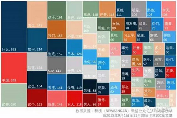 标题是10万+阅读的基础,如果标题起的不好,推送后没人看,再好的内容也无法传播出去。在这9100个标题之中,运营喵通过词频统计,找出了出现次数多于50次的关键词共82个。其中出现次数最多的是“什么”(578次),“中国”(349次),“这些”(270次)。