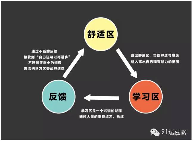 对应到相应的工作场景:假设我是一个网站的内容编辑,我每天的工作就是重复性的挑选文章——编辑(标题、排版、引流)执行这2个流程,当我重复一个月后,这件事闭着眼睛都能做完达到非常熟练后,这个时候有大部分人可能开始抱怨“这件工作没意思,学不到什么”,如果要让自己快速成长,其实这时候你应该跳出舒适区,学习一下挑选的文章怎样才是用户感兴趣的(用户需求),把这件事重复做通过外部或者自己的观察反馈,不断修正细小的问题,这个时候你可能就非常了解你的目标用户需求了。非常熟练地挑选文章之后你再进入学习区,知道用户需求之后你应该学习一下文章排版,内容的包装,这个时候你已经有意识地往用户体验这块去做了。持续性的坚持,到最后你可能就发展成一个产品经理了。其实这种每天发觉自己再进步的感觉是妙不可言的。不信?你们不妨试一下!