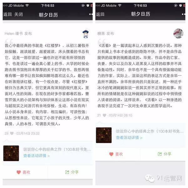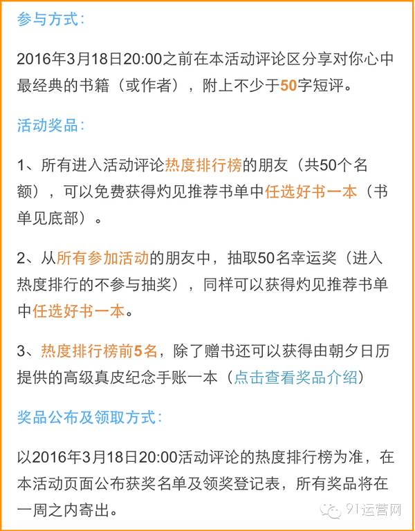 最近互联网圈兴起了一股读书热,各种读书活动层出不穷。前两天,我们也做了一场『说说你心中的经典之作』为主题的书评活动。活动发布之后短短几个小时参与人数破万,两天之内产生了将近3000条高质量书评,参与人数还在逐步增加。下面是活动截图: 一场成功的活动跟前期的策划和铺垫工作是分不开的,下面是我的一些总结和思考,供大家参考: 一、如何多维度提高活动吸引力? 一场活动效果好不好,归根结底取决于活动对用户的吸引力强不强。很多做活动运营的小伙伴感叹,现在用户越来越难满足了,不送几个iphone、ipad都不好意思做活动。其实这就把活动吸引力的构成看得太简单了。奖品固然是吸引力,但不是活动吸引力的全部,甚至不是活动吸引力的关键。我觉得活动吸引力至少有三个构成因素: 1、内容:运营人员一般习惯把内容运营和活动运营分开来。其实,如果能把内容和活动结合起来做,往往能达到更好的效果。比如,我们这次虽然做的是送书活动,但是并没有简单粗暴地抽奖送书,也没有设置各种显性隐性的诱导分享。我们的活动宣传简单而克制,只有首尾两处并不扎眼的引导。主体部分是一份长长的书单,这是我们参考各种书单和排行榜后精选出来的20本经典好书,用简约优雅的排版配上图片和简介,很具有可读性。这么一篇文章,相信用户即使不为了奖品,也愿意好好读一读内容。从后台数据来看,这篇文章的分享数和收藏数都达到了1000以上,说明用户对内容的认可度还是很高的。其实,这种把内容与活动相结合的思路完全可以在其他场合复制。比如,朋友圈随处可见的微课,如果能充分挖掘讲课嘉宾的故事,打造一片热文,然后顺带着宣传活动是不是效果会更好呢? 2、互动:《认知盈余》最后一章『寻找鼠标,世界是闲的』揭示了一个道理:只要给用户合适的工具和场景,人们并不缺少参与互动的意愿和空闲时间。反过来说,如果一场活动不能给用户提供好的互动形式,纯靠奖品的诱惑是很难到达理想效果的。长期各种『被骗』后,用户也都不傻,谁都知道拿到奖品永远是小概率事件。如何让用户在明知道获奖机会不大的情况下,还愿意参加活动呢?那就得激发用户的互动意愿。微信圈里不乏各种送奖活动。但是要么是直接抽奖,毫无互动。要么是在公众号后台按要求回复一些关键词,用户面对的是冷冰冰的自动回复,互动感很差。而我们这次活动设计的互动形式,是让用户在我们的活动页面分享他心中的经典书籍和短评,然后按照热度排行榜颁奖。这种互动形式有几个优点: 首先,话题的设计让用户有的可聊,谁还没有一两本喜欢的书呢,对于自己心中的经典之作,一般人都能写出几句评价和感悟。前面文章中提供的书单也是很好的参考。 其次,随着参与互动人数增多,活动页面实际上成了一个微型社区。早期参加的用户产生的优质内容会进一步激发后面用户的分享意愿。即使不参加,看看人家写的书评也是极好的。 最后,提供了分享和点赞机制,并跟奖品绑定,形成了竞争机制,同时也满足了用户的社交需求,提高了用户的转发动力,进而形成二次转化,吸引更多用户参加活动。 从实际情况来看,虽然我们只要求写50字短评,但是随意敷衍的用户很少,大部分用户都提交了很认真的书评。 3、奖品:奖品是活动的最直接的吸引力,丰厚与否固然重要,设置方法也有讲究。我们这次活动奖品设置我觉得有几点做得比较好的。 首先,有诚意。100本书不算少,有心要拿奖的话,难度并不大。而且获赠的书可以由用户自己选定,而不是随机赠送。 其次,有价值。书单里的20本书,都是公认的经典好书,足够有吸引力。而不是像有的活动只能送出版社指定的书,范围较窄,质量参差不齐。 最后,有层次。奖品共分为三类,进入热度排行前50名的直接送书,没有入榜的可以参与抽奖(50本),Top5的用户还能获得额外的纪念品。这种分层的奖品设置,照顾到了各种用户,让积极用户有竞争,普通用户有希望,围观用户有动力。 二、活动策划要注意哪些问题? 1、活动主题:格调与受众的平衡 做内容运营的同学都知道,选题至关重要,其实活动策划也是如此。主题定得好不好,直接影响成败。对于读书活动来说,我觉得主题最需要考虑的就是格调和受众的平衡。格调太高则曲高和寡,很难做大。试想如果做一场《梦的解析》专题读书活动,有多少人能参与互动?格调太低则有损品牌形象,让一部分高质量用户不屑参加。而且读书这个事,每个人喜好都不一样,很难有哪个主题能引起所有人的共鸣。所以我们决定做开放型的话题。但是即使如此,范围还是有点大,如何找到最佳活动主题呢?不能靠猜想,也不能随便碰运气,要用精益创业的思路去反复试错。 我们这次活动的主题确定就有一个反复尝试的过程。最开始,我们定的主题是『晒晒你的2016年度书单』。定了主题后我们先小范围做了一下尝试,发现效果不太好。分析原因是参与门槛太高,大部分人并没有做读书计划的习惯,让普通用户列一个年度书单有难度。所以,我们又将主题更改为『说说对你成长影响最大的一本书』。发现效果要好一些,但是还是不够好。分析原因是主题设计不太合理,好书固然能影响一个人的成长,但书籍的影响往往是渐进的,对于大部分人来说,很难讲哪一本书非常明显地影响了自己的成长。多以,我们把活动主题进一