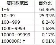 5)知乎专栏:专栏旨在为特定主题下有持续创作及合作写作需求的用户提供写作工具,创建专栏需要进行申请,通过审核后即可使用 知乎专栏整理类似于版主等形式。专栏需要作者在某一领域的长期输出。经常在知乎上有这样的问答“知乎关注人数超过xx”“知乎点赞数超过xx的问题”等等,这些形式也是激励用户持续输出,获得关注的动力 6)公共编辑:这一产生于用户的编辑团队。放权给用户,让用户参与其中,他们的任务是对问题的补充、语言规范乃至话题归类做出修订 3.金字塔的第三层、第四层 我们先了解下知乎的用户构成 围绕知乎用户最紧密的就是点赞数和关注数,也就是内容消费者和内容生产者。 在知乎经常有类似这样的问题“知乎上点赞数最多的答案是什么?”因此点赞数较多的用户通常被认为是某个领域有较高造诣的人,因此特别受到关注,而拥有较高的点赞数的用户,其成就感和荣誉感也得到极大的满足 我们都知道,往往大部分人仅仅作为内容的消费者而非生产者。那么知乎在这个金字塔顶端的回答者占比多少呢? 先来看一组数据: 表1-用户的点赞数和关注数占比 表2-内容消费者vs生产者 在这些得到赞同的用户赞同数分布情况如下: 表3-赞同数用户分布 从以上数据看出: