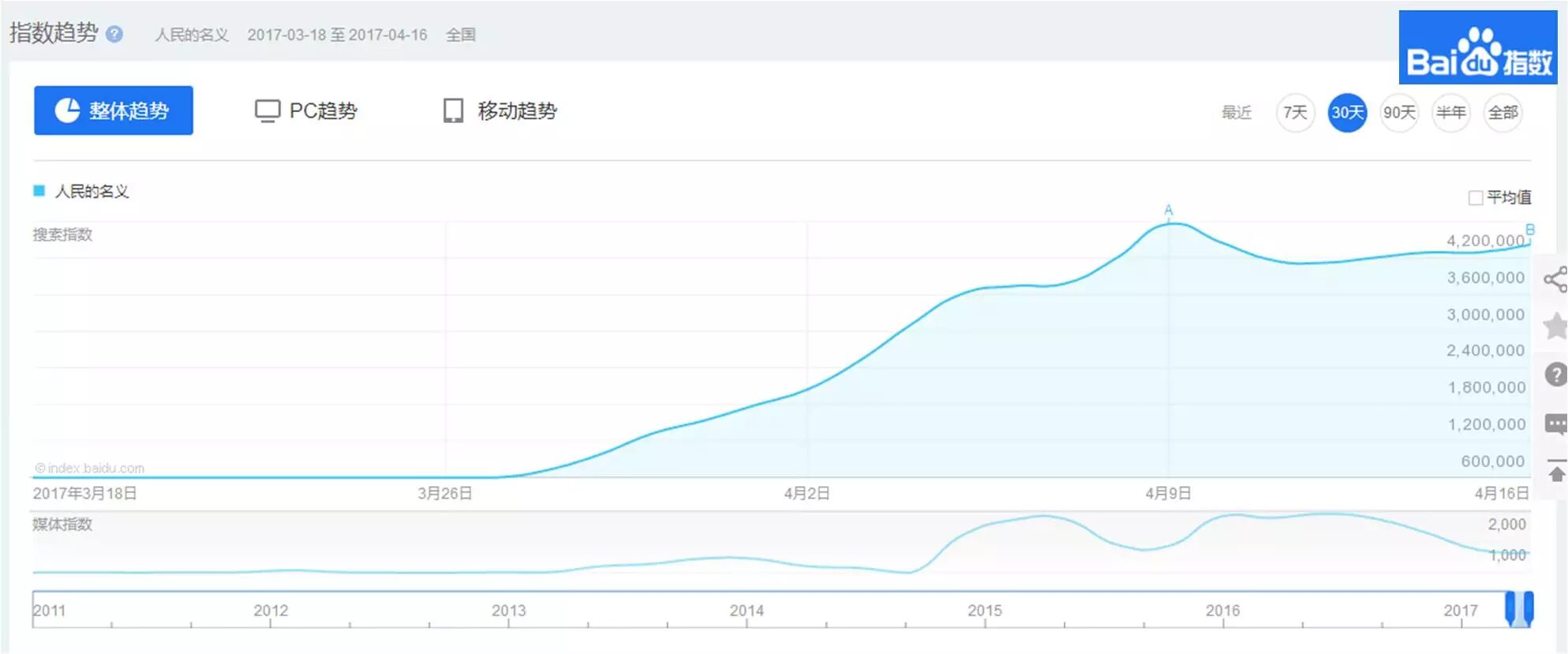 3月28日开播以来,“人民的名义”的微信指数开始攀升,在4月6日达到第一个高峰,4月10日达到目前的最高峰值,4月14日又再度高潮,一周诞生55篇10W+!
