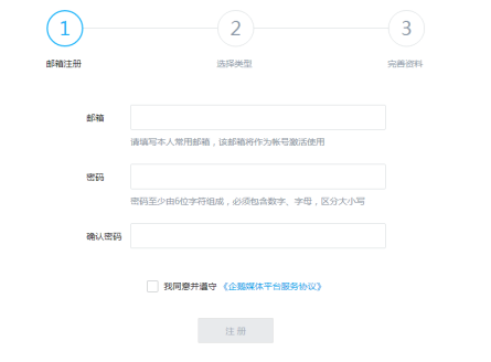 6、辅助材料填写 这一点比较关键,也是大家非常关心的问题。大家就把准备的微信公众号、新浪微博(博客)网址等填上去就好。辅助材料最好有,否则容易被拒。 7、提交信息,完成认证 填完信息,点击提交。提交之后会出现以下提醒: 点击公众号认证,用你填写的辅助材料里的公众号去认证一下就可以了。 8、等待审核 以上步骤做完,就等着审核了,一般需要1-3个工作日。 三、企鹅自媒体号申请流程 1、登录官网:https://om.qq.com,点击注册; 2、用邮箱注册 3、邮箱激活 4、选择类型,自己做的就选个人类 5、填写资料 这里要填写名称、介绍及头像等,名称最好能一眼看出是干嘛的,媒体介绍不要太长,一句话即可。