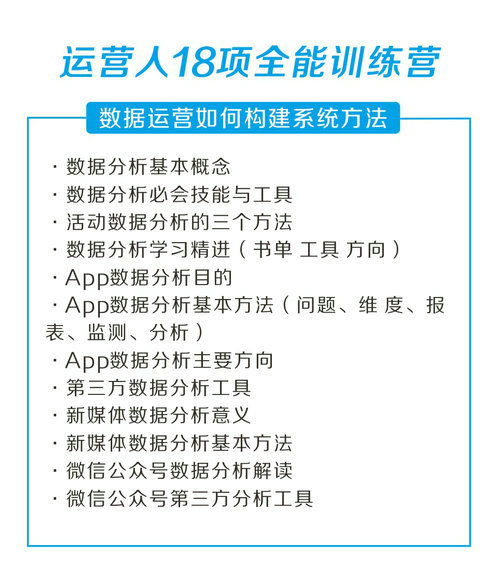 想找一份靠谱的运营工作,却没有系统的知识与方法储备? 已然是部门leader,却苦于被团队成员各种运营问题困扰? 作为公司的创始人/经营者,想提高团队的运营素养? 运营工作怎么做更有效,大会小会忙着赶场子还是犯晕? 。。。。。。 您的困扰,都可以在运营人18项全能训练营找到答案哟! 下面就让我们用5分钟先睹为快,了解一下吧!