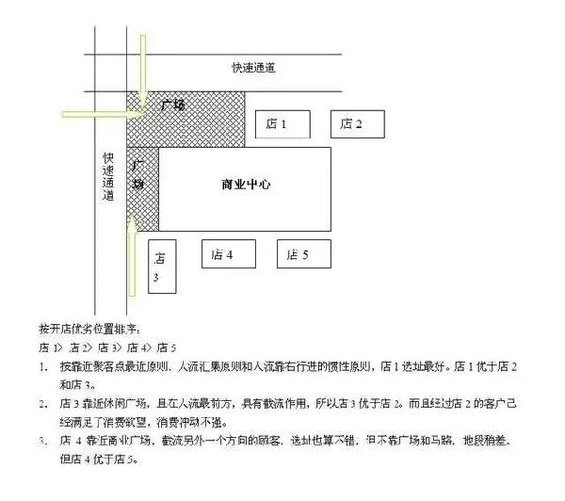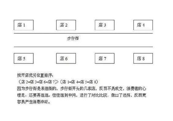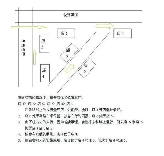 决定一家店铺成败的先行要素莫过于选址。今天,给大家分享一篇图文结合、简单易懂的选址秘诀。 -1- 在聚客点附近开店 聚客点就是能够把人集中在一起的商业地点,比如商贸中心、肯德基、大超市。 根据聚客点的客源性质开相应的店。学生多,就开小食、动漫类的店。住户多,经营一些生活用品。打工仔多,开一些廉价小吃店、简餐店,比如面条、盖浇饭、麻辣烫。 -2- 人流靠右行进原则 我们国家都是靠右行走或行驶。所以,人流在右侧,尤其是在上游的店铺,往往能优先接触到消费者。 -3- 符合消费者需要 当地消费者需要什么就开什么店。当地消费者都是普通住户,店铺要能满足其基本生活需要,比如饭店、超市、特色小吃。当地消费者住在高档小区,那可以开一些上档次的茶社、酒吧。 在酒吧一条街上,你开个内衣店,就不太符合消费者心理。在餐饮一条街上,你开个装潢材料店,也不符合消费者需要。 -4- 考虑未来五年的发展 有的地方人口或消费潜力具有很强的成长性,就可以提前布局。比如附近正在建一座写字楼,就可以从事快餐类的饭店或咖啡厅,这符合休闲、商务需要。附近正在建一座大型钢铁厂,就可以开一家24小时便利店或做夜宵。 -5- 补缺原则和品牌街原则 在一条综合性的大街上,店的品类应该比较齐全,如果缺乏一种满足刚需的店,可以考虑以补缺原则开店。 -6- 远离超级对手或与之配套 如果附近有一家超级品牌的服装店,比如七匹狼,那你就不要做档次稍低、价位差不多的男装品牌。你可以考虑做一家品牌女装店,与品牌男装店相配套。如果附近有一家肯德基,你不宜做一家汉堡店,反而可以考虑做一家中餐厅。 -7- 在消费环境浓厚的地方开店 路人≠消费者,在没有消费氛围的环境里,他们缺乏消费动力。反之,消费环境浓厚的环境里,很多人就被感染,好像不花点钱就不好意思。 -8- 在路人易停留的地方开店 有的地方虽然人流量比较大,但大多数只是匆匆赶路。比如在一些快速通道边上开店,少有人停留。但如果是广场附近,还有些艺人表演节目,大街上的行人会饶有兴致地观看,渐渐汇集人气,就更有机会激发消费。 -9- 截流和汇集 你的店要在同类店铺里起到截流的作用,即尽量靠近人流的上游。 人流在哪个点汇集,就把店开在哪儿。如果好几条路上的人流都汇集在一条路上,这条路上开店效果最佳。