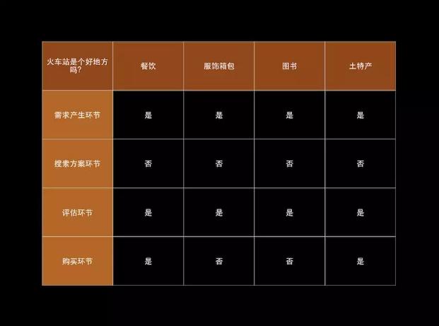 现在,我们大致可以猜到服饰箱包等品牌商在火车站布局线下店的目的了。这些品类的消费者购买模型中,一定有一个或多个很适合在线下产生。