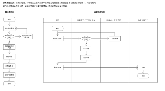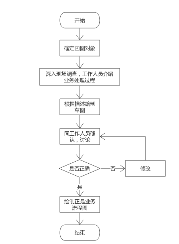 以上是明确给出了业务描述,按照步骤基本上便能画出业务流程图。在没有明确给出业务描述的情况下,对业务流程的梳理主要有两种方式: 1)深入现场调查,由工作人员介绍业务处理过程。
