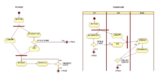 UML细分了各种图,分别在不同的角度来描述系统流程,在本质上,UML各种图均属于流程图。 其中UML中活动图同管理业务流程图类似可用于表示业务过程,唯一的区别是活动图支持并行行为。传统的流程图着重描述处理过程,它的主要控制结构是顺序、分支和循环,各个处理过程之间有严格的顺序和时间关系;而UML活动图描述的是对象活动的顺序关系所遵循的规则,它着重表现的是系统的行为,而非系统的处理过程。 那UML活动图是如何来表示并发业务流程的呢? UML活动图也可包含为基本活动图和泳道活动图,表达的方式与管理业务流程图差不多,但图例上稍有不同(图例区别可参考下方)。