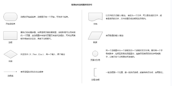 同管理业务流程图一样,泳道让流程中个角色的分工一目了然。一个泳道表示流程内的一个角色,泳道内仅仅画出该泳道所表示角色完成的活动(判断,并行等可以画在任意泳道)。 总结:管理业务流程图或UML活动图均可以用来表达业务流程,具体使用哪种图来表达业务流程可以凭君喜好,但要遵循一定的符号结构,不要混搭。不过要表达并行行为的还是使用UML活动图吧。 4.两种流程图图例和结构 (1)管理业务流程图 管理业务流程图的常用符号如下,其基本结构包含:顺序结构、选择(分支)结构、循环结构。