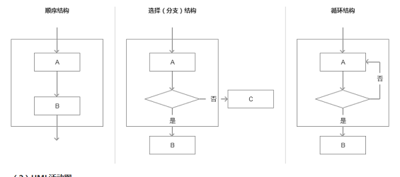 (2)UML活动图 UML活动图的常用符号如下,其基本结构除了顺序结构、选择(分支)结构和循环结构外,还可能存在并发的事件流。在UML中,可以采用一个同步线来说明这些并行控制流的分岔和汇合。