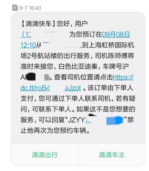 办完票,进了休息室。等飞机。刚坐下来,13:27分,我收到一条滴滴的短信:车已经到达出发地点,您可以通过下单人联系司机。