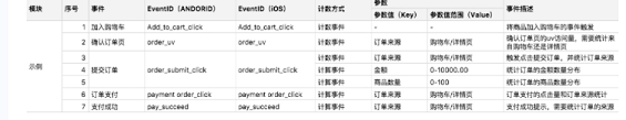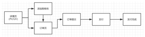 1.2 收集统计,明确统计目的和意义 如果是产品经理做埋点收集,也可以从以下的几点思路出发: 功能流程转化率:关键业务的留存转化指标尤为重要,用户在哪个关键节点发生了流失, 改版调整:如果产品做了改版,肯定会在一些关键入口进行了布局上的优化,那么埋点统计有利于收集变化前后的不同。产品是否更加聚焦的解决了用户的痛点,还是 用户轨迹:用户来到了你的产品,第一件事情是做什么,然后还会做什么。如果你的产品,满足了用户的需求,那么主要路径我们是可以猜测得到的。但唯独那么一小块路径,是否会挖掘出更深层次的需求。 面向运营方面的,一次完整的活动运营,在工作的前中后阶段,对数据的需求都不太一样: 活动前,需要了解面向的用户、兴趣、标签、来源,入口的引导和布局,有了这些,才可以更好地评估面向对象、渠道。而这些,在产品早期建立数据的时候,需要第一时间就考虑的问题。 活动中:对数据的时效性要求更高,落地页或者活动页面的PV/UV、活动参与数、页面登陆数、中奖数、兑奖数、活动转化人数/金额以及用户信息等。必要的时候根据数据反馈及时调整问题和优化。 活动后:更加注重反馈和总结,对活动的复盘;本次活动的带来了多少的访问流量,转化率如何,不同渠道过来的用户表现如何,最终这些用户转化成活跃用户的又有多少? 其他: Boss:“小李啊,这个活动上了,但是效果不怎么样,你觉得哪里可以再优化优化?” 小李:“伟大的老板,是这样的,关于这次活动的,我整理了一份报表,通过分析这些数据后,有一个方案,请看看….” 不管来自哪个方面的需求,收集数据必然是来源于分析目的,基于目的,才会有分析指标,才会有数据的收集。 1.3 根据产品流程设计指标 在前面做了一系列的功课之后,我们就开始要根据产品的功能流程或者页面结构,定义好分析的目的,剥离关键流程,提炼关键指标。 购物环节:宝贝详情页>加入购物车>订单确定>订单提交>支付>支付结果