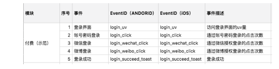 对应的可能想要了解到注册流程的转化,那么可以主要采集注册按钮点击事件、提交信息事件、获取验证事件、注册成功事件,再加上能够统计到渠道包信息,那么也就可以分析出,不同渠道下的用户转化效果。 二、提出需求 可能前面的内容,大部分的干货可能会讲的比这个更清楚了,那么笔者在这里更多的是想要跟大家分享一下,如何提出埋点的需求。 有些公司可能会有自己独立的数据系统,用于收集用户数据。但是大部分公司而言,更多的是专注业务本身,所以埋点也是用了第三方。 目前有很多做埋点和数据支持的公司,例如友盟、诸葛IO、GrowingIO、神策等等,也有埋入移动端、H5、Web等,在进行选择的时候,不妨多进行对比,没有哪家最好,只有哪家最合适。 在这里,笔者用的是友盟统计。 2.1 收集事件 首先先理解什么是“事件”,可以理解为触发一个动作、行为或者到达某个条件,都是一个事件(Event)。 例如:在登录中,填写完信息后,点击一下“登录”按钮,或者点视频的“播放”按钮,页面流程的“下一步”按钮,获取到“登录成功”,访问某个页面,这些触发的行为都可以理解为一个事件。 因此,沿着流程和产品结构,会得到这么一个表格: