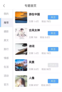 每个话题还可以进一步细分,比如摄影专题可以衍生出风景、人像、手机摄影、城市影像、纪实摄影、爱拍动物、赏花。