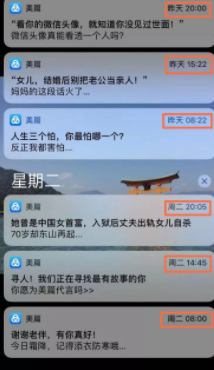 消息的推送途径一般有Push、站内信、EDM。在我使用美篇的过程中,发现美篇主要使用Push,而且Push的推送时间有一定的规律。如下图所示,一般在三个时间段进行Push推送:早上八点、晚上八点、下午三点左右。