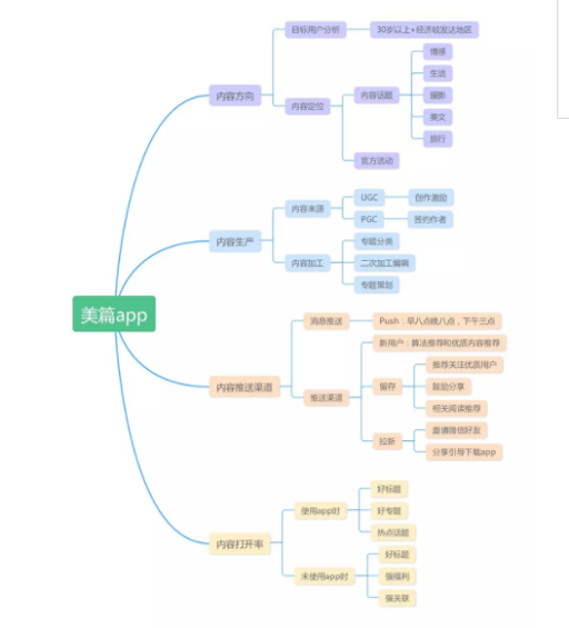 我用脑图简单总结一下美篇app在内容运营上的方法,发现美篇在内容运营上有四点值得人们关注: