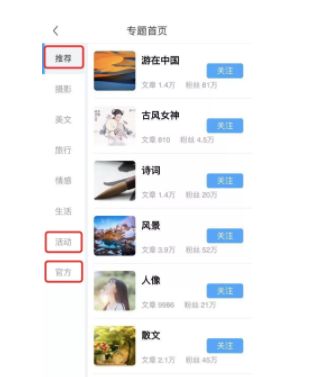 另外,编辑会对美篇的一部分内容选题进行二次加工,其中主要收录在“专题-推荐”、“专题-活动”、“专题-官方”中: