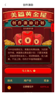 后台将这个活动放在了首页上,简化报名步骤。用户点击报名后可以“写文章天天赚收益,用才华创造财富”,还可以查看排行榜和奖金收入。