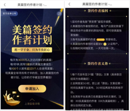 为了进一步促进优质内容的产出,美篇在2017年推出了「签约作者」活动。对于已签约的作者,可以免除“赞赏费”的提现手续费、获得美篇官方给予的报酬。还可以加V、加「签约作者」标志。