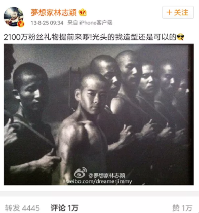2013年8月25日,林志颖为庆祝其微博粉丝量达到2100万在其微博“梦想家林志颖”发布了一条图文微博。微博图片原图系知名摄影师朱庆福的摄影作品《中华男儿》,而林志颖将图片中左起第三名战士的脸PS成了自己的脸,后朱庆福以PS照侵权为由将其诉至北京市海淀区人民法院。事后,林志颖发微博公开道歉并主动接受赔偿。