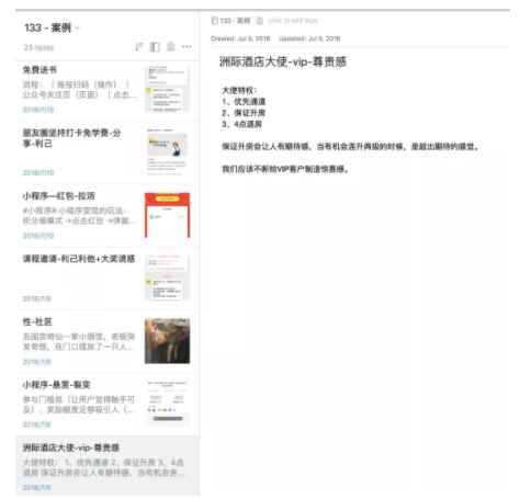 在企业的运营实际操作中,我们难免要借鉴别人的想法和做法,尤其在现在,小视频、小程序等新形式层出不穷,朋友圈没几天就会被刷一波屏。我现在看到一个觉得不错的案例,就会截图保存下来,加上自己的观察和分析,再打上几个标签,存在Evernote中。