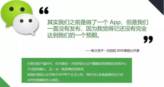 2018年5月,微信公众号的“订阅号助手”终于上线了,然而这个千呼万唤始出来的独立APP在我看来是微信团队做的最不用心的一个产品了,极其失败,微信重视内容生产者,曾推出非常多贴心使用的功能,但这次的订阅号助手是一个例外,它并非边缘产品,张小龙在2018微信公开课专门谈到过这个产品。