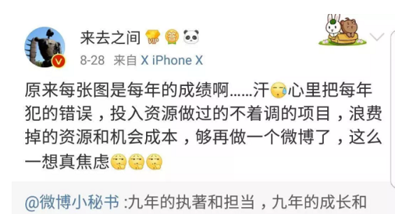 2018年8月28日,微博CEO来去之间转发庆祝微博九周年的时候说了这样一段话: