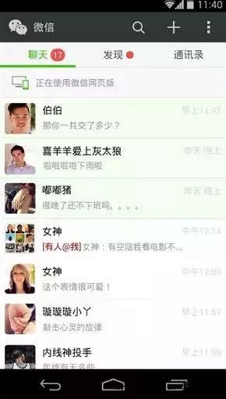 并非我们所熟悉的大版本号3.0、4.0、5.0等等,而是一个小版本号——安卓版本5.2,因为这个版本把微信最核心的底部导栏修改成了顶部导栏,通过左右滑动的方式切换聊天、通讯录和朋友圈,我把它称之为“安卓原教旨主义版”。 然而这是一个短命的版本,仅仅5个月之后的5.4版本就改过来了,回归到了今天经典的底部导航,从此再也没有改回去过。
