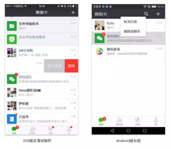 如今,微信尽管在整体界面上和iOS保持一致,但在很多细节方面依然遵循了安卓规范,比如在聊天界面要置顶某个对话,安卓是长按、iOS 是左滑。