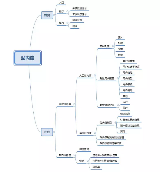 前端主要是用户查看站内信,要方便用户操作,添加必要的提示,并对不同类型的消息进行分类;后端主要管理站内信的类型、创建和统计。