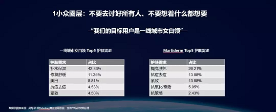 一二线白领女性的护肤需求是什么?从需求程度轻重依次排序来看,分别是补水保湿、修复舒缓、美白、抗痘去痘、紧致。这是一个比较大众的需求,所有品牌都在试图满足这些需求,但是网红品牌Martiderm不一样,它满足的需求依次是提亮肤色、抗痘去痘、紧致、抗氧化。