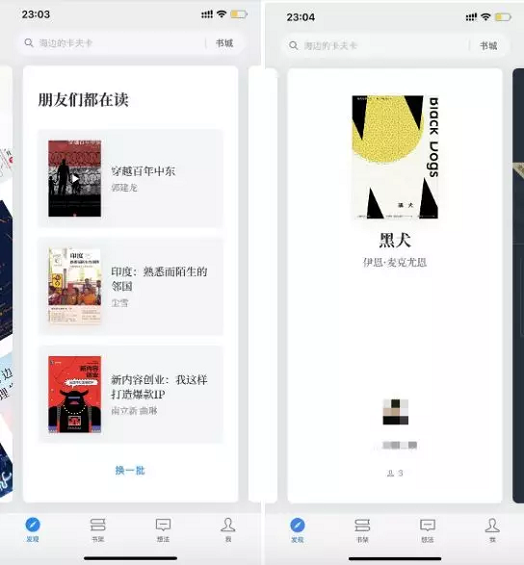 用户不需要像其他阅读app那样,打开先要花时间去想要读什么,再去书城搜索某本书;而是可以看到好友正在读什么,这种基于熟人社交的信任感,自然而然地会想要去了解好友正在读的书;如果这本书n个好友都在读,就会更加激发用户的好奇心,避免了漫无目的的寻找读物,减少时间成本。