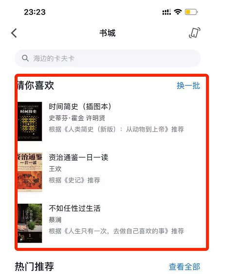 微信读书,可根据你的阅读历史记录,多维度去给你推荐“你可能喜欢”的读物——如同作者、同品类的书等等。
