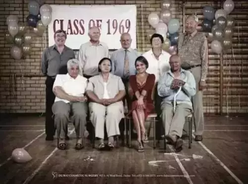 广告内容是1969年毕业的一群老人多年后的同学会,基本都是老头老太,而中间一位面带自信笑容的红衣少妇无论面容和身材,都像是他们的孙女辈。很明显,她也是同学之一,整个广告都凸显了整容的魅力和成功。