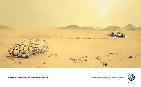 还有大众汽车一个以“地球上最艰苦的比赛”为题的广告,其他品牌的车在环境恶劣的沙漠中慢慢只剩下残骸,整个画面也是一片萧条,而大众汽车依然是在沙漠中飞速奔驰,性能耐力十足。