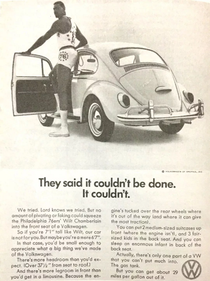 他们说办不到,真的办不到 我们尽力了!上帝都知道我们真的尽力了。 但是,想把费城76人队的张伯伦塞入VW前座,真的不太可能。 因此,如果你和张伯伦一样七尺高,我们的车不适合你。 但是你可能只有六英尺七英寸高。 这样的话,你的身材就让你有机会欣赏我们在VW上有多么巨大的成就。 ……