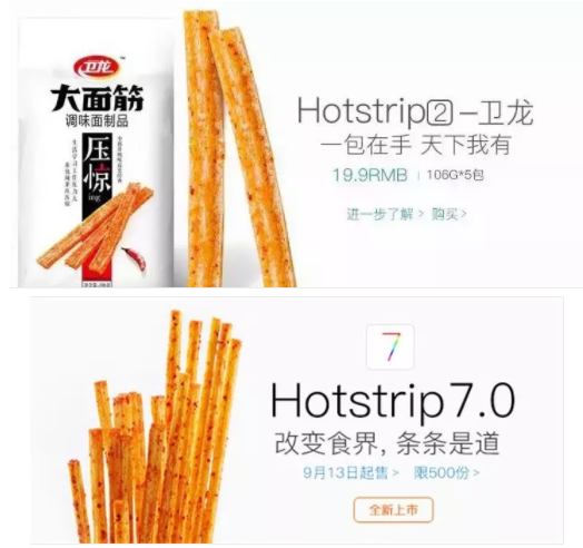 卫龙辣条之前淘宝旗舰店更新惊为天人,完全不同于同类产品的风格,浓浓的苹果风和过去消费者对于辣条的认知形成强烈反差,把熟悉的场景陌生化,太能抓眼球了。