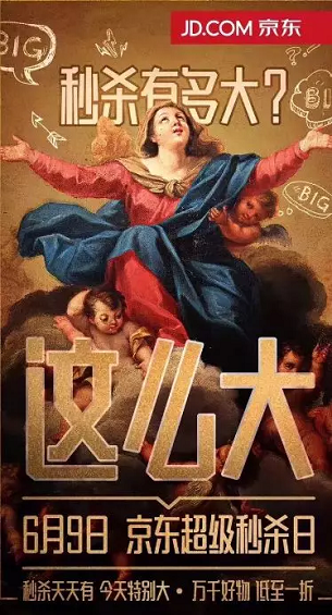 京东在去年618期间推出“京东秒杀日,今天特别大”的海报,也是把大家熟悉的世界名画给予了全新视觉,反差感立马就出来了。